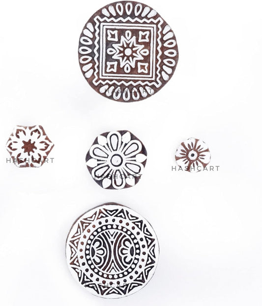 Round Shape Wooden Stamp Block for Block Printing - Handcarved Stamps for Saree Border/Scrapbook/Fabric/Textile/Paper/Clay/Pottery (Set of 5) Hashcart®