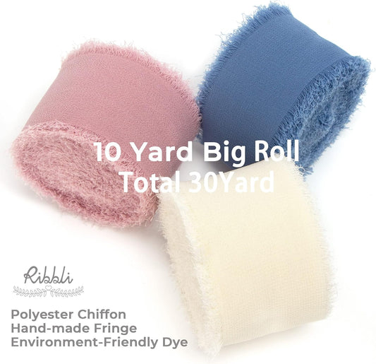 Ribbli Chiffon Silk Ribbon, 1.5 in x 30 Yards, Ivory/Dusty Rose/Dusty Blue Fringe for Wedding Invitations, Bridal Bouquets, Flower Arrangements