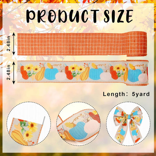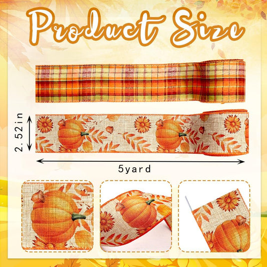 2 Rolls Fall Pumpkins Ribbons for Bows, Thanksgiving Wired Edge Burlap Ribbon Autumn Maple Leaves Plaid Ribbons for Gift Wrapping Thanksgiving Decoration Supplies