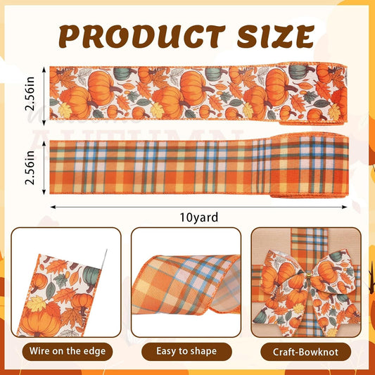 Threetols 2 Rolls 10 Yards Fall Wired Edge Ribbons, 2.5inch Orange Plaid Burlap Ribbon, Autumn Leaves Pumpkin Ribbon for Harvest Thanksgiving Party DIY Craft Fall Wreath Bow Decor