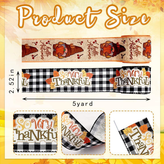 Threetols 2 Rolls 10 Yards Fall Wired Edge Ribbons, 2.5inch Black White Plaid Burlap Ribbon, Autumn Leaves Gnomes Pumpkin Ribbon for Thanksgiving Party DIY Craft Fall Wreath Bow Decor