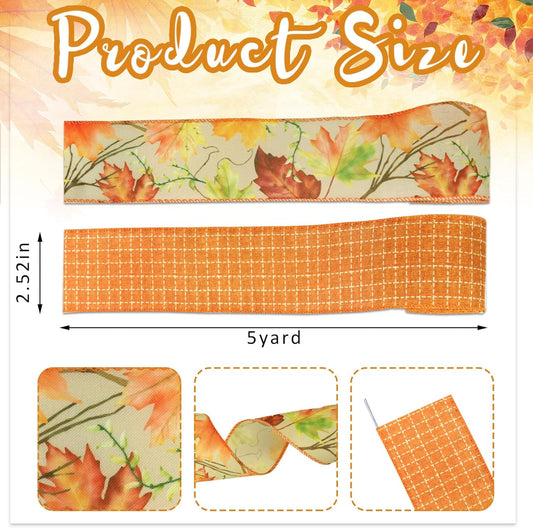 2 Rolls Fall Pumpkin Craft Ribbons for Wreath Bows, 2.5"×10 Yards Thanksgiving Wired Edge Ribbon Orange Burlap Autumn Leaves Wired Ribbons for Crafting Sewing Supplies