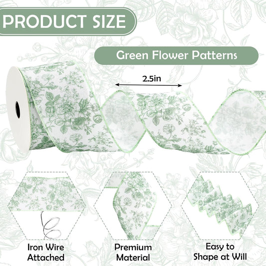 AnyDesign Floral Wired Edge Ribbon Roll Green Flower Ribbon Chinoiserie Fabric Ribbon for Wreath Bow Making DIY Crafts Gift Wrapping, 12 Yard