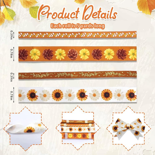 4 PCS Thanksgiving Fall Ribbons for Crafting, 3/8''Width and 4/5''Width Flowers Ribbons White Orange Satin Ribbon Metallic Leaves Craft Ribbons for Gift Wrapping Fall Decorations
