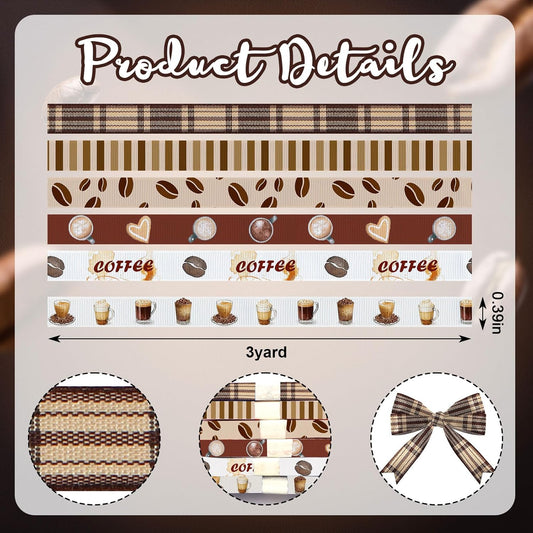 6 Rolls 18 Yards Fall Coffee Ribbons for Gift Wrapping DIY Crafts 3/8 Inches Brown Plaid Grosgrain Ribbons Coffee Beans Ribbon for Wreath Hair Bows Home Party Decoration