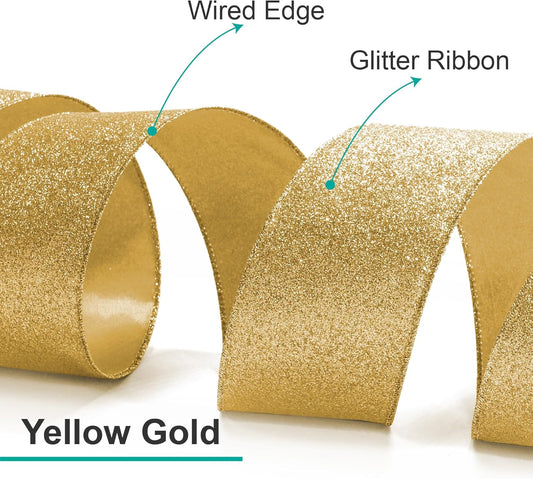 CT CRAFT LLC Glitter Wired Ribbon 2.5" x 10 Yards Yellow Gold for Christmas Home Decor Bow Gift Wrapping DIY Crafts Wreath