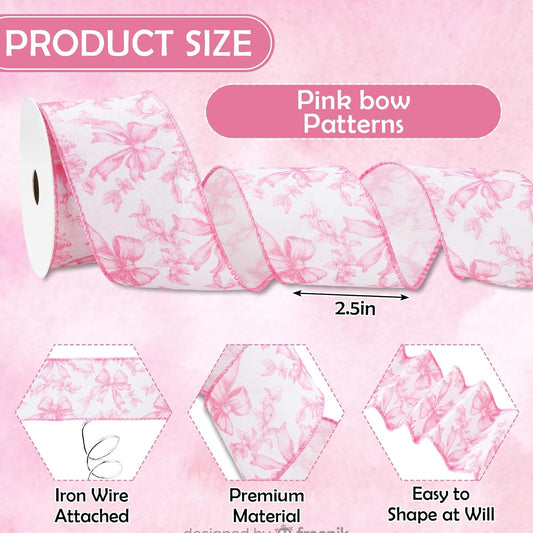 Pink Floral Bow Wired Edge Ribbon Chinoiserie Flower Bowknot Fabric Ribbon for DIY Crafts Wreath Bow Making Supplies, 12 Yard