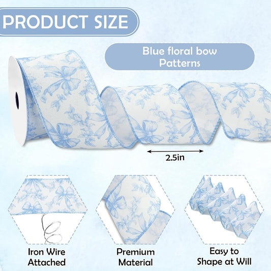 Blue Floral Bow Wired Edge Ribbon Chinoiserie Flower Bowknot Fabric Ribbon for DIY Crafts Wreath Bow Making Supplies, 12 Yard