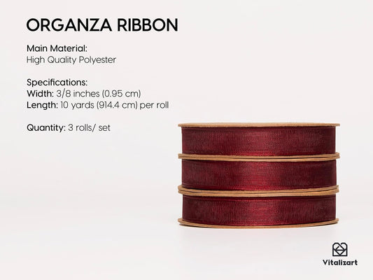 Vitalizart 3/8" x 30Yd Organza Ribbon Christmas Red Sheer Ribbons Set 10 Yd x 3 Rolls Handmade Eco-Friendly for Gift Wrapping Christmas Tree Crafts Bows Wedding Invitations Wreaths Wrap