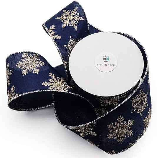 CT CRAFT LLC Navy Satin Gold Snowflake Wired Ribbon 2.5 Inch x 10 Yards for Christmas Home Decor Tree Topper Bow Gift Wrapping DIY Crafts Wreath Garland