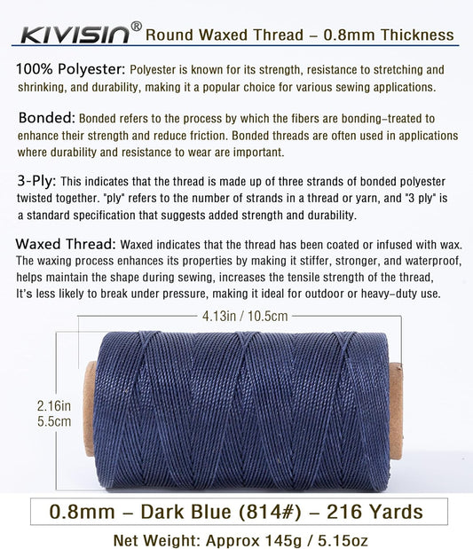 Heavy Duty Round Waxed Thread 0.8mm, 218 Yards, Dark Blue, Bonded Thick Polyester Wax Coated Cord for Leather Sewing, Upholstery, Whipping Twine, Basket Weaving and Macrame Making