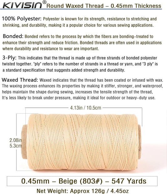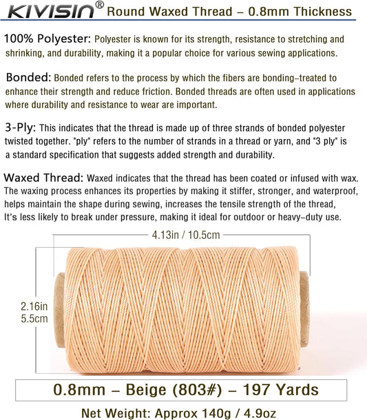 Bonded 0.8mm Round Waxed Polyester Cord, 3-ply Wax Coated Thread, 197 Yards Stiff String for Heavy Duty Fabric, Leather Sewing, Book Binding, Upholstery Repair, and Macrame Jewelry - Beige