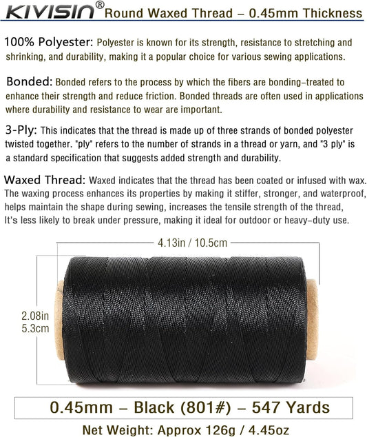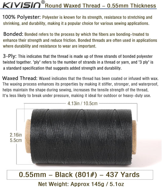 Sturdy Bonded Waxed Polyester Thread, 0.55mm, 437 Yards Wax String Cord - Black for Leather, Hand Sewing, Stitching, Beading, Bookbinding, Bracelets and Macrame Jewelry Making