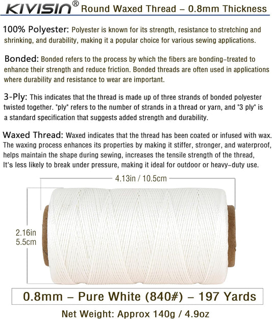 Bonded 0.8mm Round Waxed Polyester Cord, 3-ply Wax Coated Thread, 197 Yards Stiff String for Heavy Duty Fabric, Leather Sewing, Book Binding, Upholstery Repair, and Macrame Jewelry - White