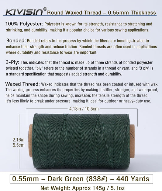 Round Waxed Polyester Thread 0.55mm, 440 Yards, Dark Green, Stiff 3 Ply Leather Wax String for Hand Sewing, Beading, Knotting, Book Binding, Upholstery, Macrame Jewelry and Bracelets Making