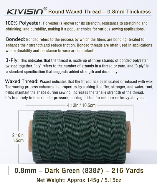 Heavy Duty Round Waxed Thread 0.8mm, 218 Yards, Dark Green, Bonded Thick Polyester Wax Coated Cord for Leather Sewing, Upholstery, Whipping Twine, Basket Weaving and Macrame Making