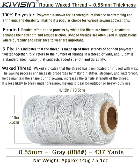 Sturdy Bonded Waxed Polyester Thread, 0.55mm, 437 Yards Wax String Cord - Gray for Leather, Hand Sewing, Stitching, Bookbinding, Beading, Bracelets and Macrame Jewelry Making