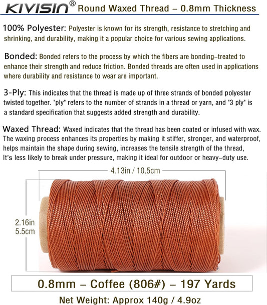 Bonded 0.8mm Round Waxed Polyester Cord, 3-ply Wax Coated Thread, 197 Yards Stiff String for Heavy Duty Fabric, Leather Sewing, Book Binding, Upholstery Repair, and Macrame Jewelry - Coffee