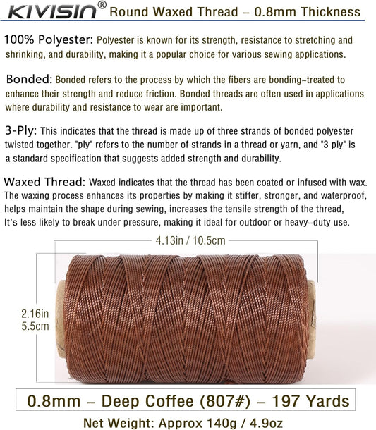 Bonded 0.8mm Round Waxed Polyester Cord, 3-ply Wax Coated Thread, 197 Yards Stiff String for Heavy Duty Fabric, Leather Sewing, Book Binding, Upholstery Repair, and Macrame Jewelry - Deep Coffee