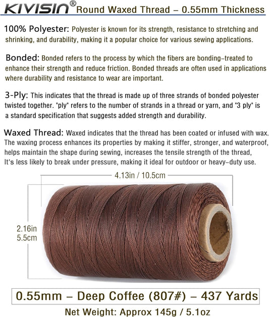 Sturdy Bonded Waxed Polyester Thread, 0.55mm, 437 Yards Wax String Cord - Deep Coffee for Leather, Hand Sewing, Stitching, Bookbinding, Beading, Bracelets and Macrame Jewelry Making
