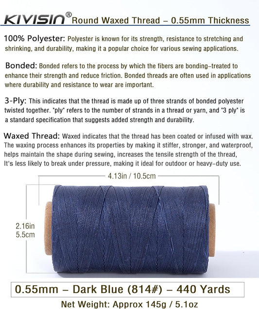 Round Waxed Polyester Thread 0.55mm, 440 Yards, Dark Blue, Stiff 3 Ply Leather Wax String for Hand Sewing, Beading, Knotting, Book Binding, Upholstery, Macrame Jewelry and Bracelets Making