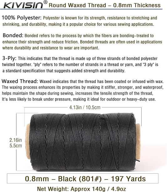 Bonded 0.8mm Round Waxed Polyester Cord, 3-ply Wax Coated Thread, 197 Yards Stiff String for Heavy Duty Fabric, Leather Sewing, Book Binding, Upholstery Repair, and Macrame Jewelry - Black