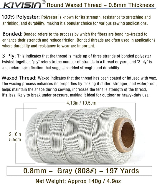 Bonded 0.8mm Round Waxed Polyester Cord, 3-ply Wax Coated Thread, 197 Yards Stiff String for Heavy Duty Fabric, Leather Sewing, Book Binding, Upholstery Repair, and Macrame Jewelry - Gray