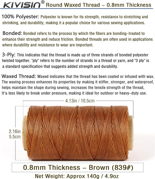 Bonded 0.8mm Round Waxed Polyester Cord, 3-ply Wax Coated Thread, 197 Yards Stiff String for Heavy Duty Fabric, Leather Sewing, Book Binding, Upholstery Repair, and Macrame Jewelry - Brown