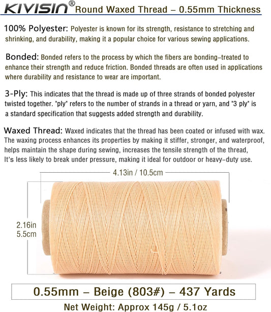 Sturdy Bonded Waxed Polyester Thread, 0.55mm, 437 Yards Wax String Cord - Beige for Leather, Hand Sewing, Stitching, Beading, Bookbinding, Bracelets and Macrame Jewelry Making