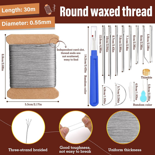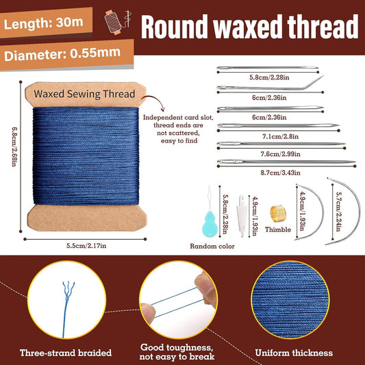 Repair Sewing Kit, Upholstery Needle with 32 Yard Waxed Thread and 8 Pcs Heavy Duty Leather Needles for Hand Stitching, Canvas & Quilting - 0.55mm Round Waxed Thread Dark Blue