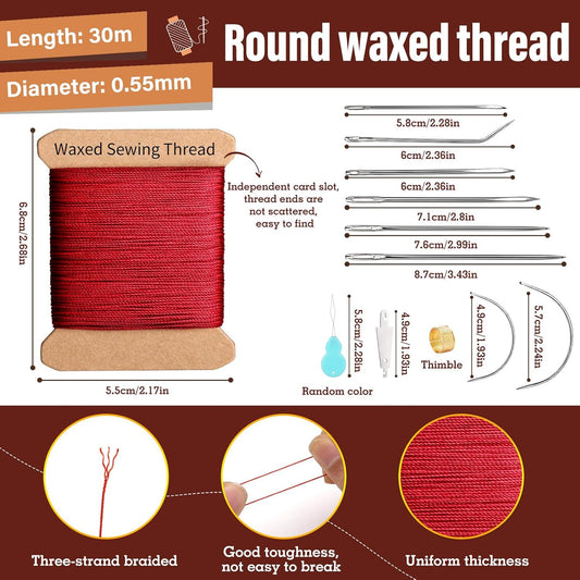 Repair Sewing Kit, Upholstery Needle with 32 Yard Waxed Thread and 8 Pcs Heavy Duty Leather Needles for Hand Stitching, Canvas & Quilting - 0.55mm Round Waxed Thread Dark Red