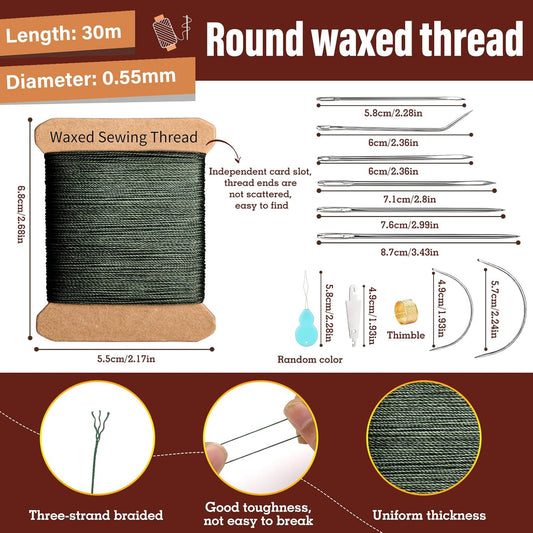 Repair Sewing Kit, Upholstery Needle and Thread Kit with 32 Yard Waxed Thread and 8 Pcs Heavy Duty Leather Needles for Hand Stitching, Canvas & Quilting - 0.55mm Round Waxed Green
