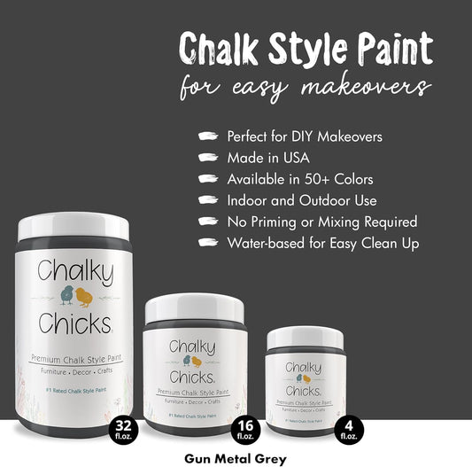 Chalky Chicks All-in-One Chalk Paint for Furniture or Cabinet -32Fl Oz-Matte Finish Gun Metal Gray (Dark Gray) for Metal, Wood Furniture Paint - No Sanding All-in-One for Home Decor & Crafts, USA Made