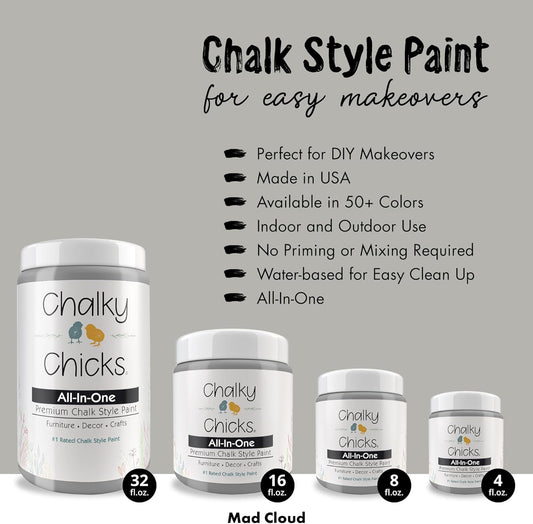 Chalky Chicks All-in-One Chalk Paint for Furniture or Cabinet - 32 Fl Oz - Matte Finish Mad Cloud (Light Gray) for Metal, Wood Furniture Paint - No Sanding All-in-One for Home Decor & Crafts, USA Made