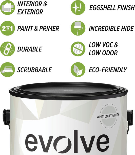 EVOLVE Paint & Primer: Environment-friendly, Low Sheen with One-coat Coverage for Interior & Exterior surfaces (Antique White, 5-Gallon)