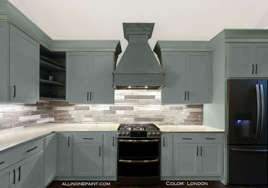 ALL-IN-ONE Paint, Durable cabinet and furniture paint. Built in primer and top coat, no sanding needed. Includes our 30 featured color card - London (green gray), Quart