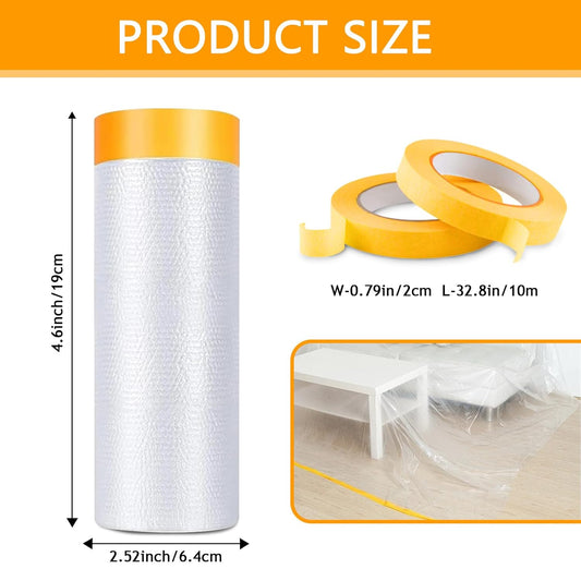 Pre-Taped Masking Film 3 Pack Each 118in x 65 feet Rolls, Tape and Drape, Painters Plastic Sheeting Drop Cloth for Automotive Painting Covering, House Decoration Furniture Floor Dustproof Cover
