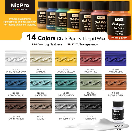 Nicpro 14 Colors Chalk Paint for Furniture, Ultra Matte Finish Acrylic Craft Paint Set (8.45 oz, 250ml) Chalk Furniture Paints with Liquid Wax, Color Wheel for Crafts, Home Decor, Beginner and Artists