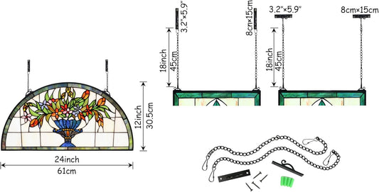 24 inch Flower Stained Glass Window Hanging Half Moon Shade,100% Real Stained Glass Panelfor Home Decor(YLK005)