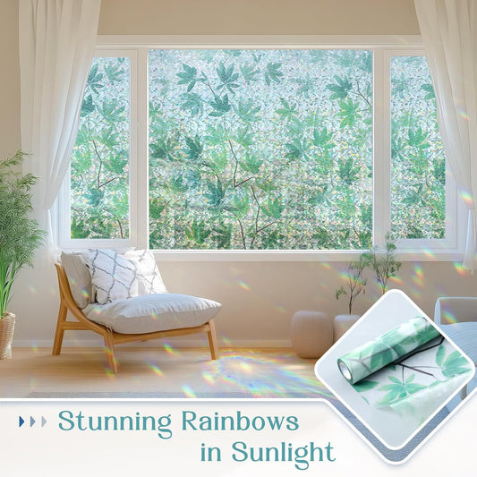Haton Window Privacy Film, Decorative Stained Glass Window Clings, 3D UV Sun Blocking Sticker, Removable Static Cling Heat Control Tint for Home Door, Leaf Rainbow, 23.6" x 157.4" Non-Adhesive