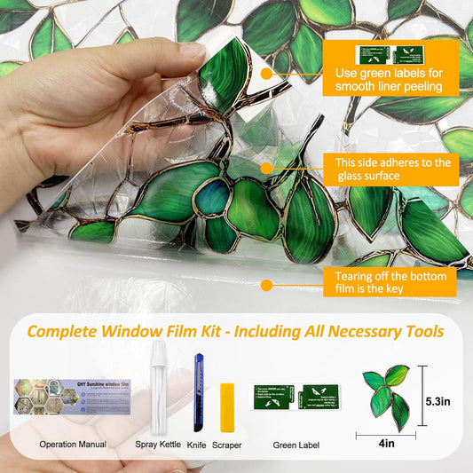 Stained Glass Window Film Static Cling Door Privacy Film Decorative Flowers Green Leaves Window Decals Stickers Heat Control Anti UV for Home and Office,17.5 inches by 78.7 inches