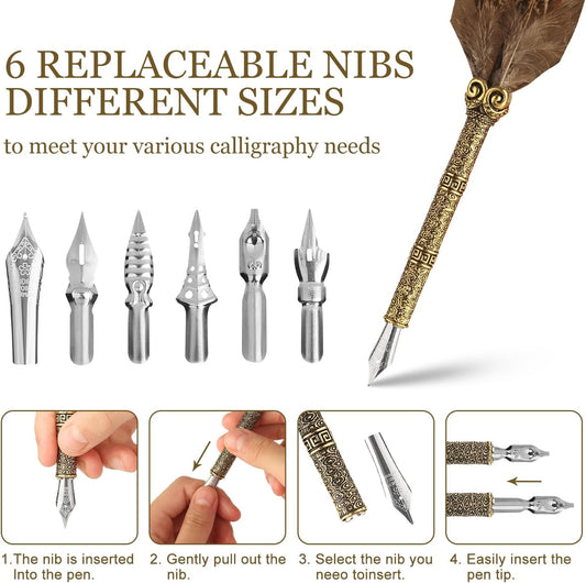 GC QUILL Calligraphy Set - 18pcs With Dual Tip Fountain Pen, Feather Dip Pen, Stamp, Wax Candle, Pen Base, Ink Bottle, Cartridges