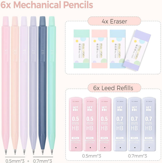 SKYDUE Cute Mechanical Pencils Set with Case, 6PCS 0.5mm & 0.7mm Mechanical Pencils, 360PCS HB Lead Refills, 4PCS Pastel Erasers, Pastel Back to School Supplies for Girls