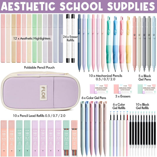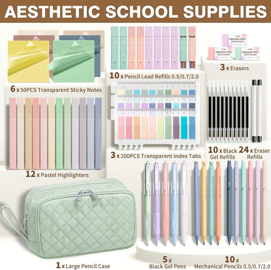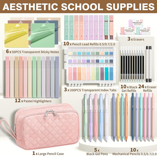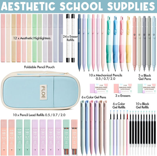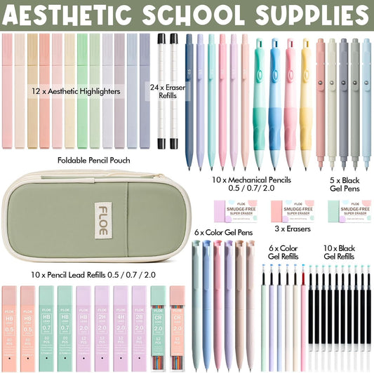 65PCS Aesthetic School Supplies with Cute Pencil Case, Pastel Highlighters Gel Pens Mechanical Pencils Set 0.5 0.7 & 2.0mm, Office Back to School Supplies College Essentials Kit Student Stationary Set