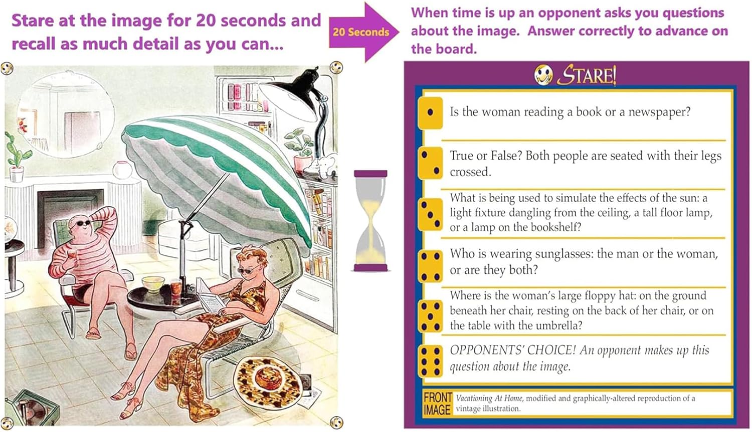 - Prepare to play Stare! – where a blank stare won’t do! In this engaging game, you'll need more than just a gaze—you’ll need to sharpen your eye for detail. Each card presents a unique image that challenges your recall. How much can you remember?