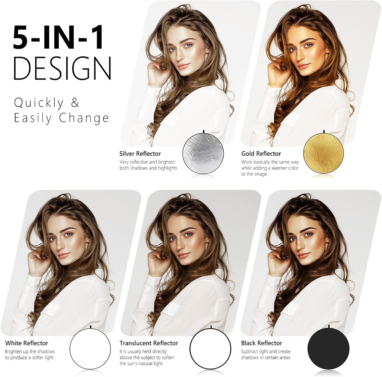 NEEWER 22 Inch/60 Centimeter Light Reflector Light Diffuser 5 in 1 Collapsible Multi Disc with Bag - Translucent, Silver, Gold, White, and Black for Studio Photography Lighting and Outdoor Lighting