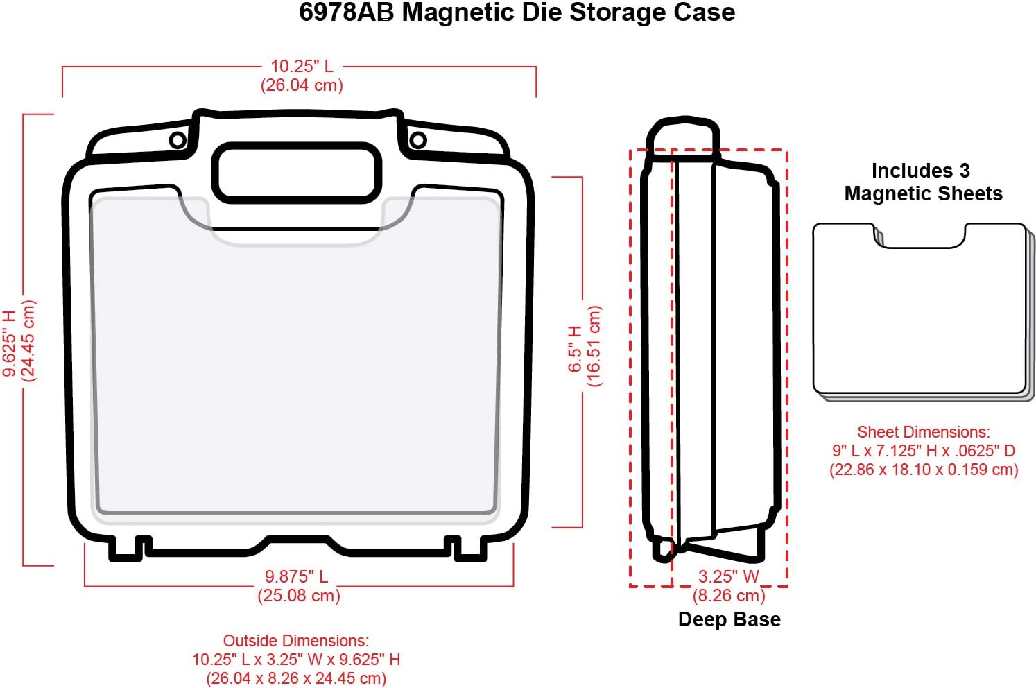 - Magnetic Design: This set includes [3] magnetic die storage sheets made with strong magnets that hold all of your metal cutting dies securely in place. Total case capacity is approximately 21 sheets. Additional sheets can be purchased separately.