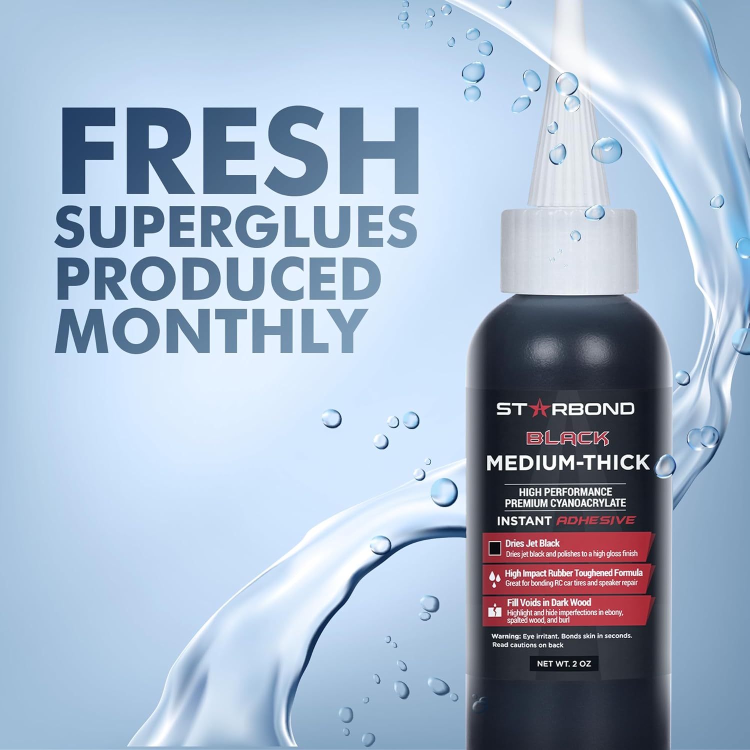 - ā PREMIUM CYANOACRYLATE SUPER GLUE - LAB TESTED FOR OPTIMAL PERFORMANCE: High performance industrial grade adhesive. Starbond Black Medium Thick CA is used to bond parts, with focus on impact and shock absorbance qualities