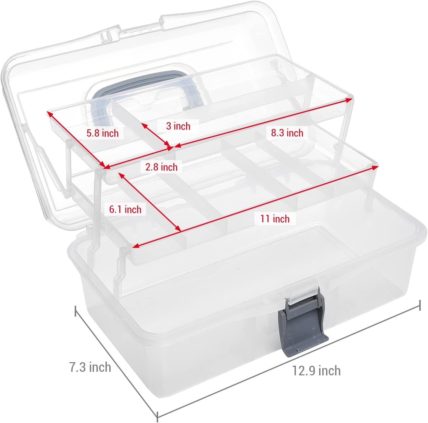 MyGift 13 Inch Transparent Plastic Empty Multipurpose Storage Box with Gray Handle, Latching Lid and 2 Expandable Trays for Tools, First Aid, Sewing Kit, Arts Crafts Supplies