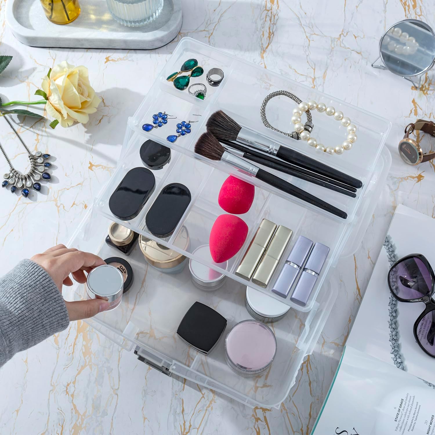 - 2 expandable trays feature a total of 8 compartments for organizing smaller items, while a larger space below provides additional storage